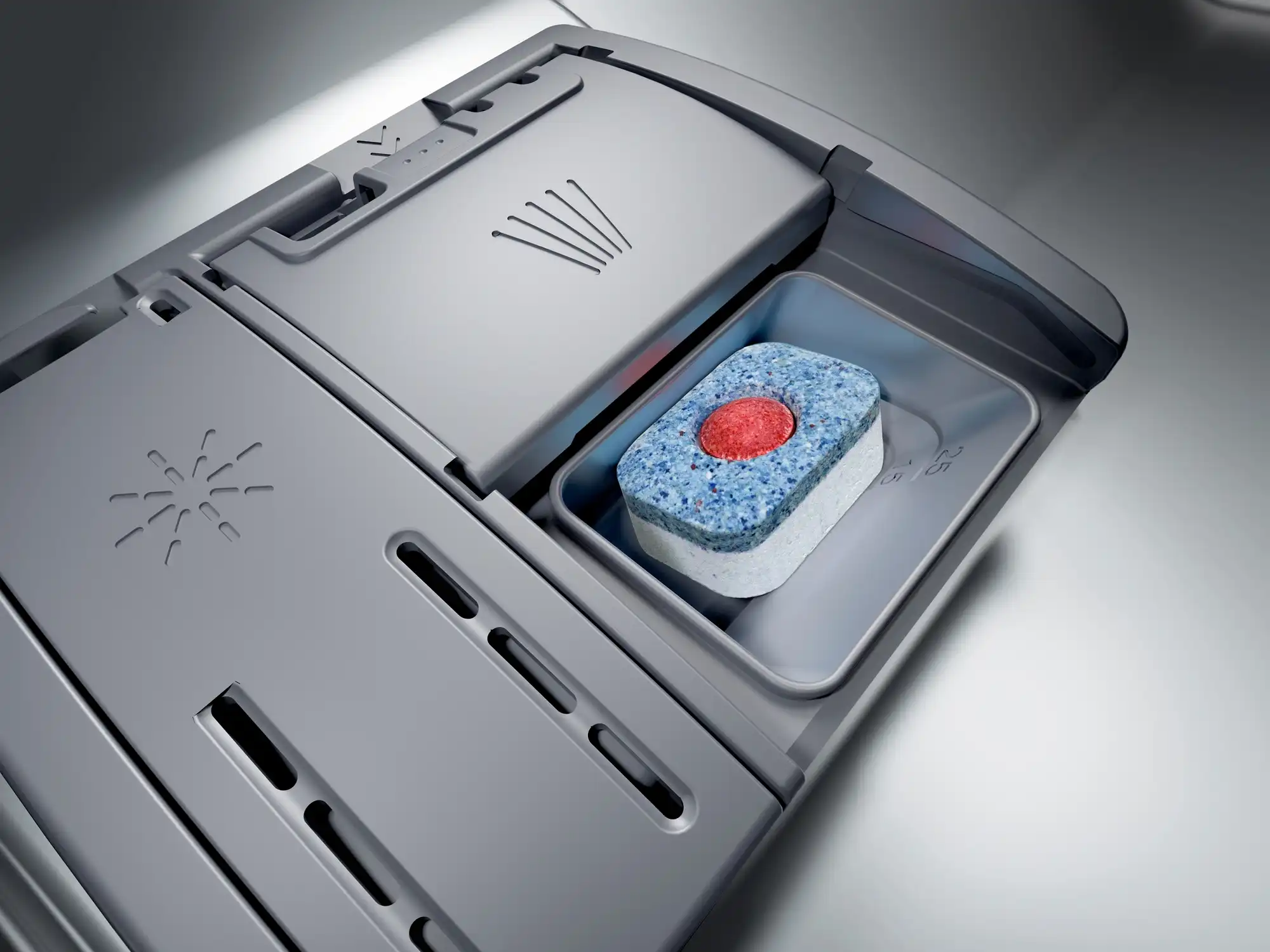 Pomočnik pri doziranju zagotavlja optimalne rezultate čiščenja in tišji postopek pranja. Pralno sredstvo pade iz predala za pralno sredstvo v poseben pladenj na zgornji košari, kjer se popolnoma raztopi.